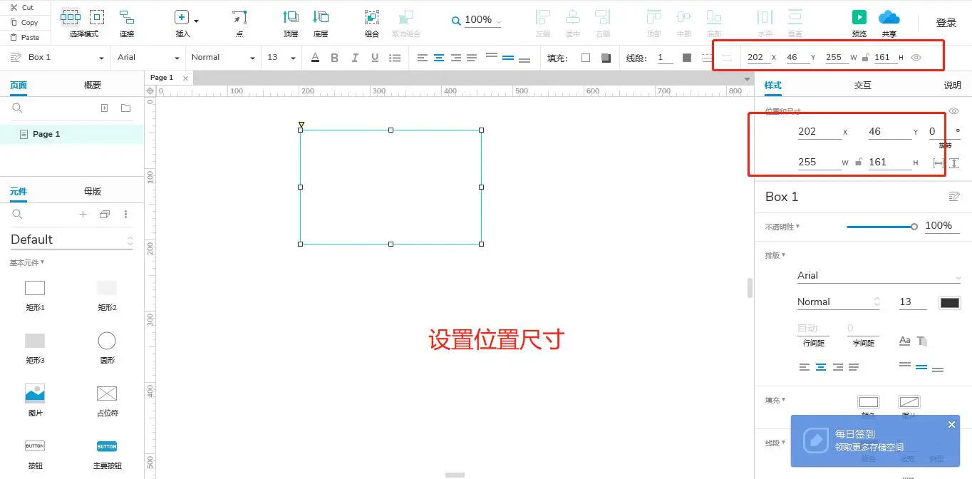 设置位置尺寸:有多种方式可以设置,第一种选中元件按住鼠标左键拖拽来改变位置,鼠标左键选中矩形上的编辑点拖拽来改变大小,这种方式可以随意设置改变,第二种设置精确的长度宽度,位置,最好的方法是在右侧样式面板---位置和尺寸中设置相应的值,第三种在上方工具栏中也有位置和尺寸的快捷设置。如图2-3