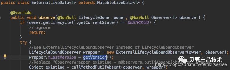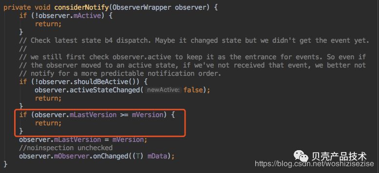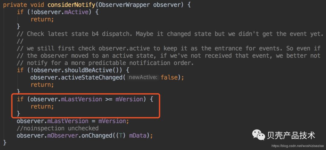 这样就能保证新注册的订阅者在初始if (observer.mLastVersion >= mVersion) {