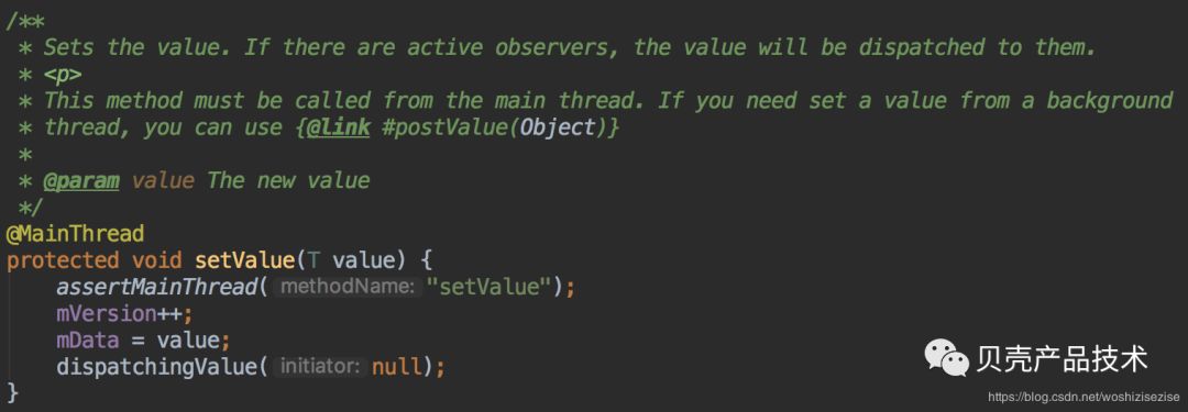 从注释中知道,如果有处于活跃状态的观察者,value将会通知到它们,setValue方法必须在UI线程中调用,并且指出,如果需要从后台线程使用的话,可以使用postValue方法。
