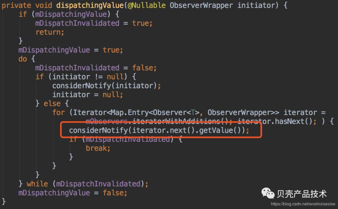 当生命周期处于STARTED或RESUMED时,就会执行红框中的逻辑,其实咱们上面已经看过了dispatchingValue方法,再来看一次: