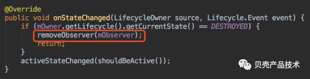 LifecycleBoundObserver实现了GenericLifecycleObserver,在生命周期发生改变时会回调onStateChanged方法,如果Activity/Fragment对生命周期时destroyed的时候,就会触发removeObserver(mObserver)操作,否则就会执行activeStateChanged(shouldBeActive())方法。