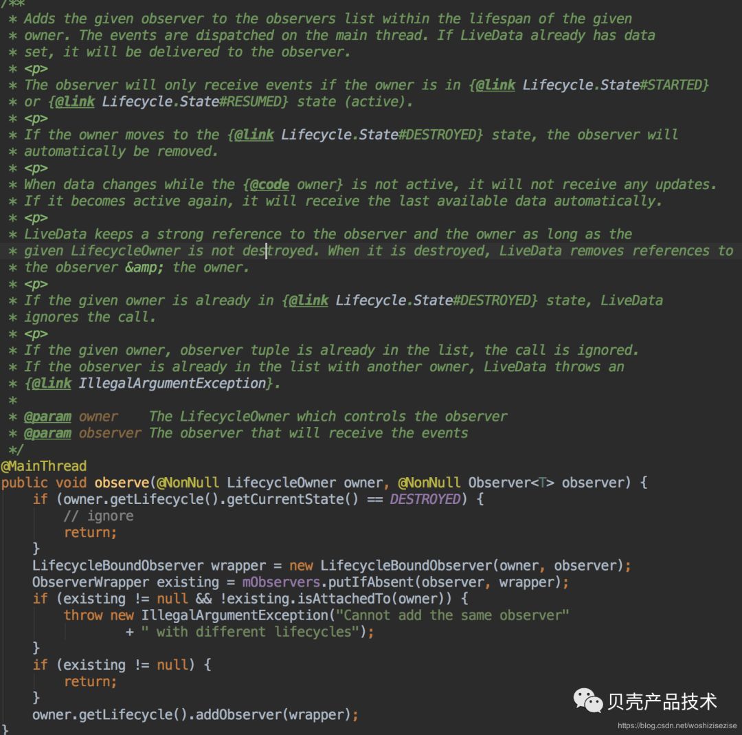 从注释中得知,订阅事件在主线程上调度,如果LiveData已经有了数据集,它将被传递给观察者。只有所有者处于Link Lifecycle.State Started或Resumed状态时,观察者才会接收事件,如果所有者移动到Link Lifecycle.State Destroyed状态,则观察者将被自动删除。当数据在owner不处于活动状态,它将不会接收任何更新,如果它再次处于活动状态,它将自动接收最后一个可用数据。只要给定的生命周期所有者没有destroy,LiveData将保持对观察者和所有者的强引用,当它被销毁时,LiveData将删除对观察者和所有者的引用。