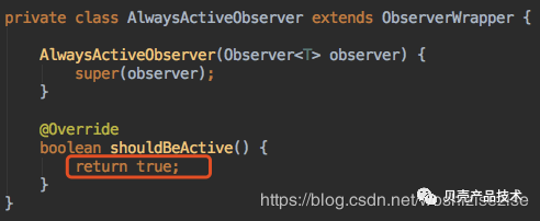 这个类的shouldBeActive方法return true;这个状态表明不受生命周期的影响了。另外wrapper.activeStateChanged(true);也是传入了一个true,所以在