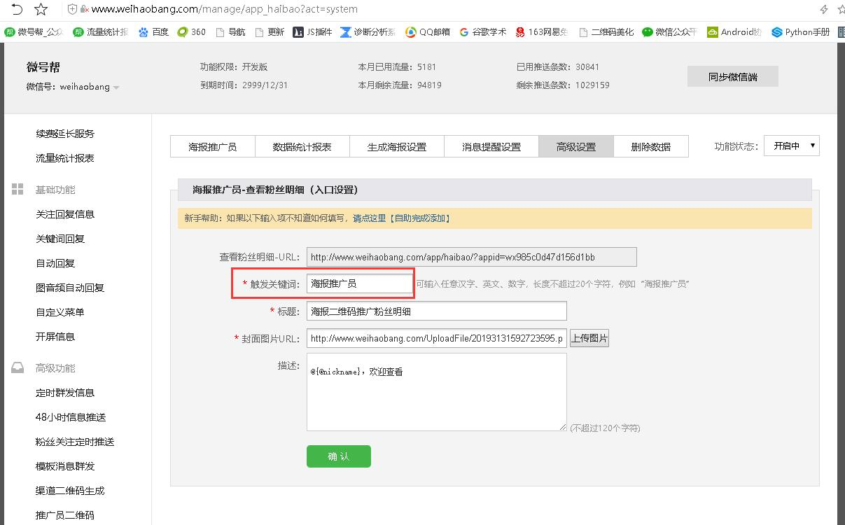 设置海报二维码粉丝明细查看的关键词,发送:海报推广员 到公众号