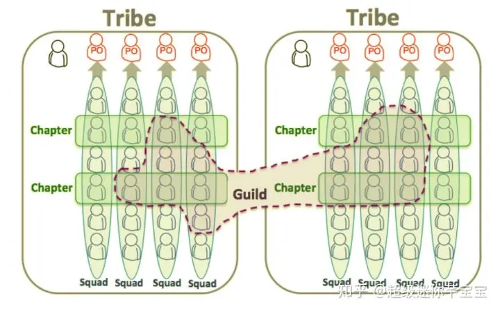 在squad之上,spotify还有两层组织架构:具有相关专业知识的人横向组成“分会”(chapter),工作在相似领域的squad组成“部落”(tribe)。此外,具有相同兴趣的人组成“行会”(guild)。