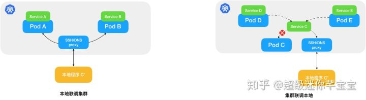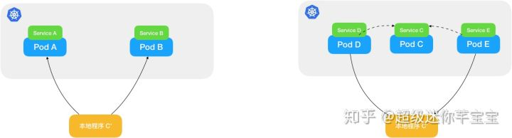 - 其它的服务依赖了我:运行在Kubernetes集群中的其它应用可以在不做任何改变的情况下访问我到运行的本地的代码,如下图右。