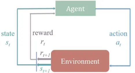 智能体从环境中获取一个状态St; 智能体根据状态St采取一个动作at; 受到at的影响,环境发生变化,转换到新的状态St+1; 环境反馈给智能体一个奖励(正向为奖励,负向则为惩罚)。