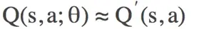 DQN是深度学习与强化学习的结合,即使用神经网络代替Q-learning中Q表。在普通的Q-learning中,当状态和动作空间是离散且维数不高时可使用Q-Table储存每个状态动作对的Q值,但是当状态和动作空间是高维或者连续时,使用Q-Table不现实,而神经网络恰好擅长于此。因此将Q-Table的更新问题变成一个函数拟合问题,相近的状态得到相近的输出动作。具体来说,比如我们现在还有一个Q值表,神经网络的作用就是给定一个状态s和动作a,预测对应的Q值,使得神经网络的结果与Q表中的值接近。不过DQN的方式肯定不能继续维护一个Q表,所以将上次反馈的奖励作为逼近的目标,如下式,通过更新参数 θ 使Q函数逼近最优Q值 。因此,DQN就是要设计一个神经网络结构,通过函数来拟合Q值,即: