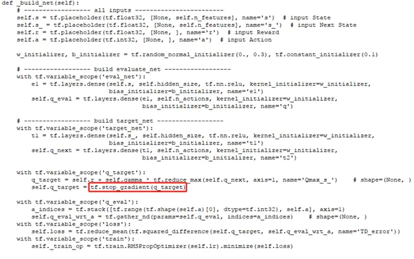 双网络结构即构建两个神经网络:target_net和eval_net,eval_net用来进行参数训练和预测Q值,而target_net是eval_net的一个副本,这个网络使用来预测目标Q值(构造标签中的yi),相当于监督训练中的label。target_net是每隔一定时间更新为eval_net的参数,这样在一段时间里目标Q值使保持不变的,一定程度降低了当前Q值和目标Q值的相关性,提高了算法稳定性。