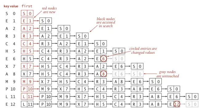 链表实现是比较容易想到和理解的方式:将所有元素连接成链表: