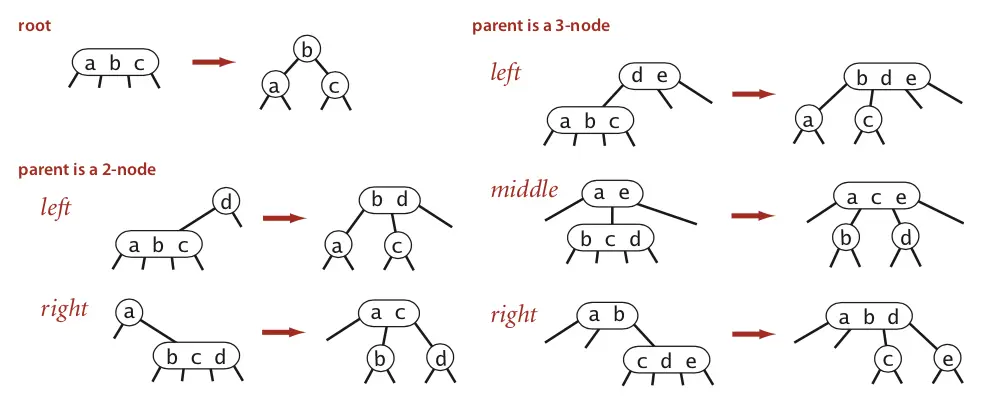 - 父节点是3节点时右侧提升 其中只有第1种情况,整棵树的高度增加,另外5种情况都是局部变化,不影响其他部分的高度,所以自始至终,2-3树都是一个平衡树。