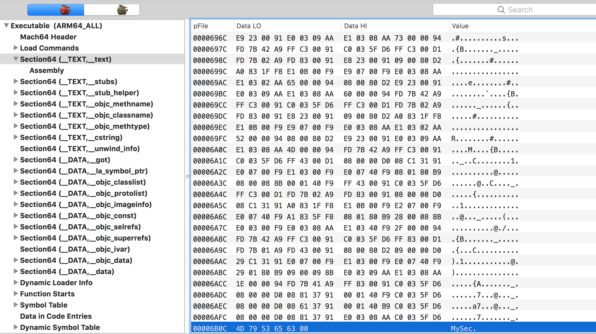 通过上文我们知道,sectionName 的值是 0x6b0c,是一个地址,这也验证了 sectionName 本身是个地址,那么 0x6b0c 存储的是不是字符串 "MySec" 呢,我们继续通过 MachOView 查看。