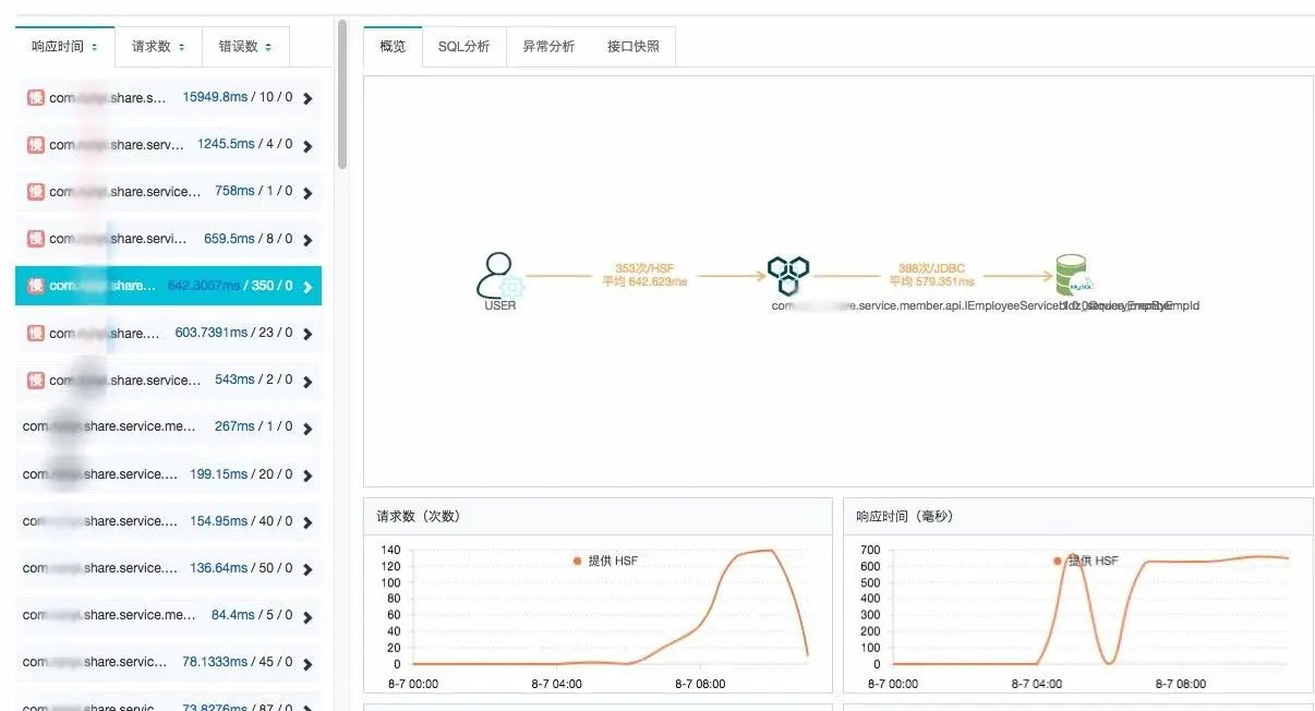 点击接口列表,我们能够一眼看到这个应用提供的所有接口以及这个接口的调用次数和耗时,当然,这些接口都是ARMS的探针自动在程序中发现的,无需做任何配置。