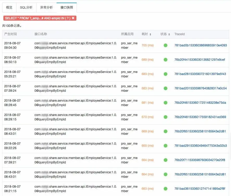 在这些接口中,“慢”接口会被明显标注出来。我们很明显地发现了可疑的慢接口。