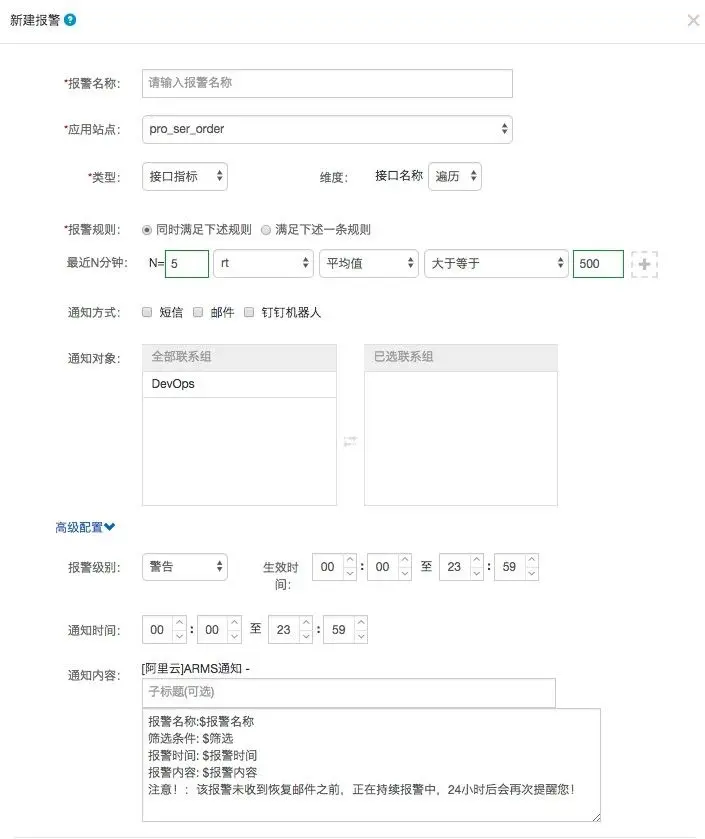 当然,您可以在ARMS的告警设置中对某一个接口或全部接口设置告警,让页面接口出现卡顿时第一时刻通知到您的运维团队。