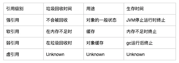 - 虚引用(PhantomReference):“虚引用”顾名思义,就是形同虚设,与其他几种引用都不同,虚引用并不会决定对象的生命周期。如果一个对象仅持有虚引用,那么它就和没有任何引用一样,在任何时候都可能被垃圾回收器回收。虚引用主要用来跟踪对象被垃圾回收器回收的活动。虚引用与软引用和弱引用的一个区别在于:虚引用必须和引用队列 (ReferenceQueue)联合使用。当垃圾回收器准备回收一个对象时,如果发现它还有虚引用,就会在回收对象的内存之前,把这个虚引用加入到与之 关联的引用队列中。