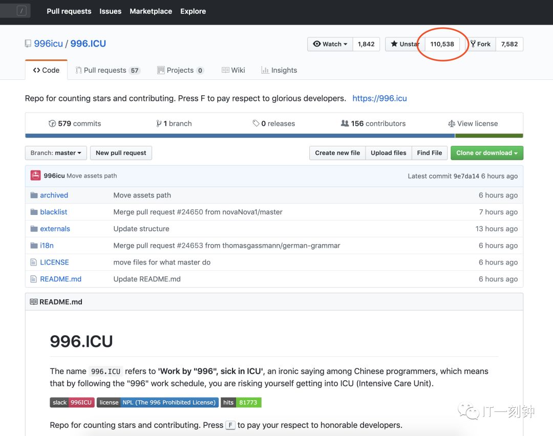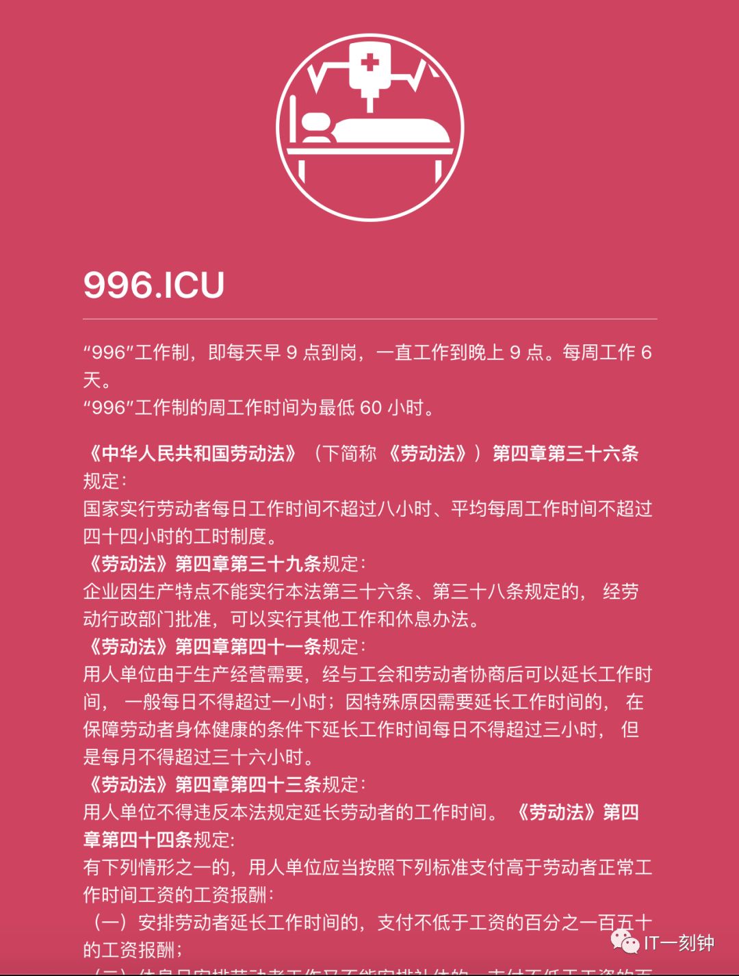 近日,在Github上出现了一件火热的事情,有人在上面创建了一个名为996.ICU的项目,同时还注册了一个叫做996.icu的域名,在网站上控诉部分互联网公司实行996工作制的惨绝人寰的行为。截止到目前为止已经有11万的Star(类似于收藏)了,堪称史上飚星最快的项目。