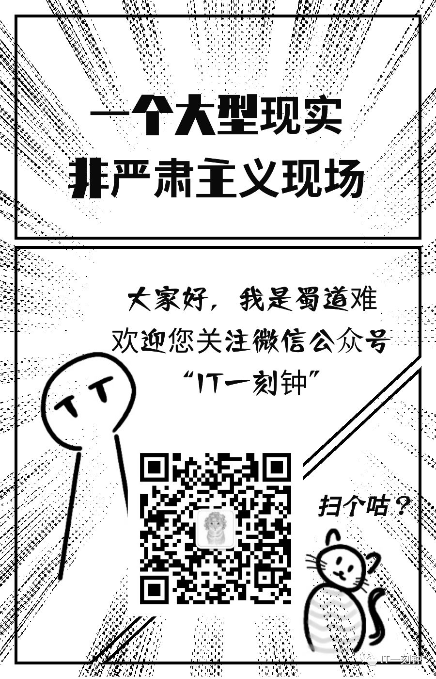 微信公众号:IT一刻钟大型现实非严肃主义现场一刻钟与你分享优质技术架构与见闻,做一个有剧情的程序员 关注可 第一时间了解更多精彩内容,定期有福利相送哟。