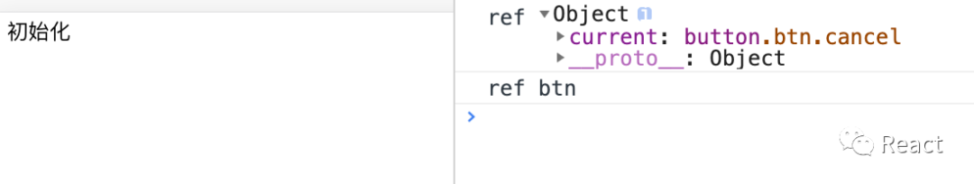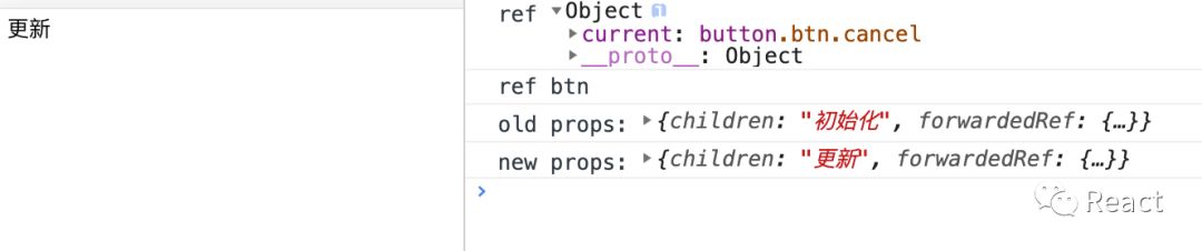 // 记录状态值变更操作function logProps(Comp) { class LogProps extends React.Component { componentDidUpdate(prevProps) { console.log('old props:', prevProps); console.log('new props:', this.props); } render() { const { forwardedRef, ...rest } = this.props; return <Comp ref={ forwardedRef } {...rest} />; } } return React.forwardRef((props, ref) => { return <LogProps { ...props } forwardedRef={ ref } />; });}// 子组件const BtnComp = React.forwardRef((props, ref) => { return ( <div> <button ref={ref} className='btn'> { props.children } </button> </div> )});// 被logProps包装后返回的新子组件const NewBtnComp = logProps(BtnComp);class TestComp extends React.Component { constructor(props) { super(props); this.btnRef = React.createRef(); this.state = { value: '初始化' } } componentDidMount() { console.log('ref', this.btnRef); console.log('ref', this.btnRef.current.className); this.btnRef.current.classList.add('cancel'); // 给BtnComp中的button添加一个class this.btnRef.current.focus(); // focus到button元素上 setTimeout(() => { this.setState({ value: '更新' }); }, 10000); } render() { return ( <NewBtnComp ref={this.btnRef}>{this.state.value}</NewBtnComp> ); }}