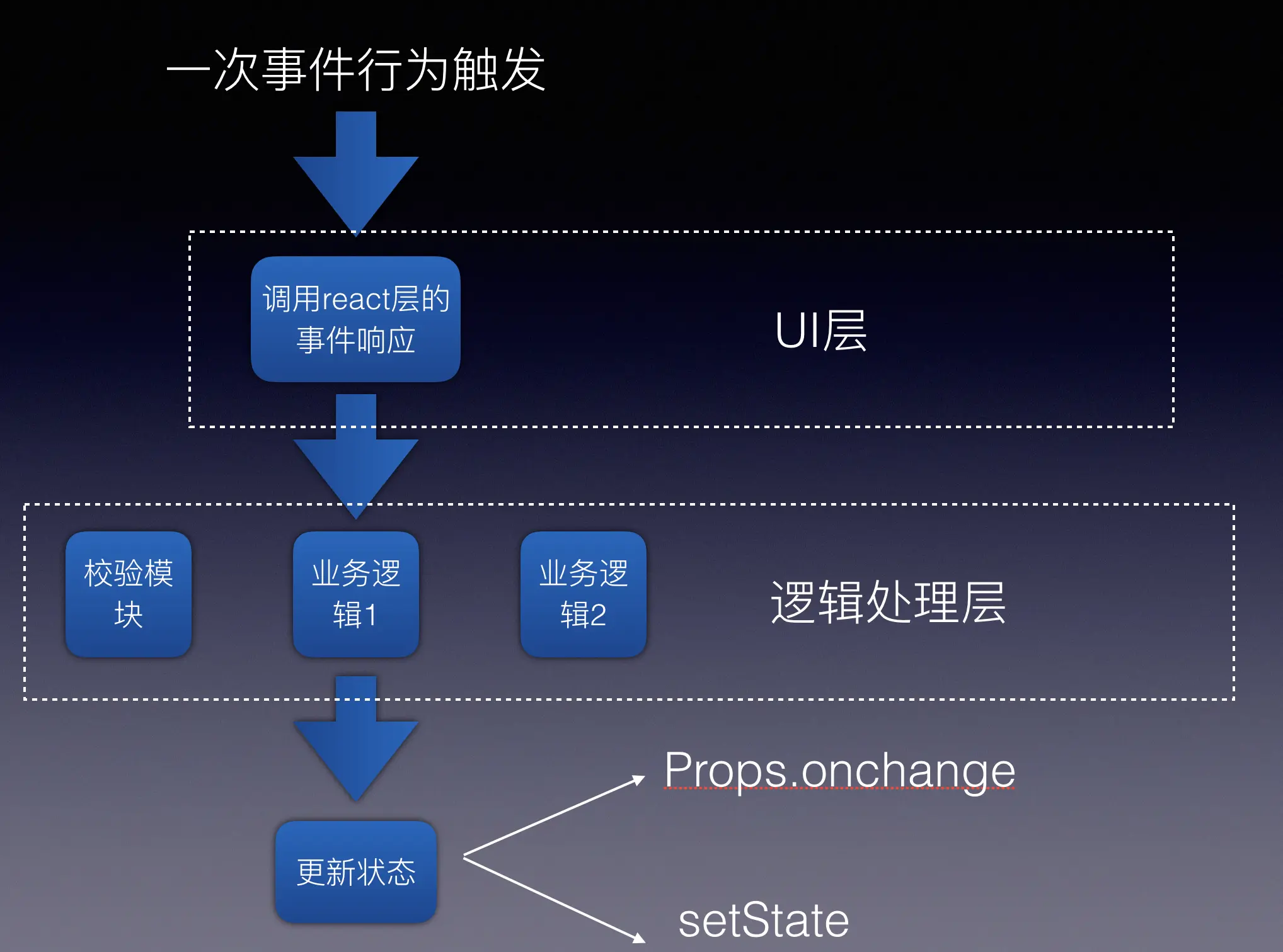 这时我们从目标结果反推方式,会发现我们偏移了我们的目标,我们并不希望界面上的ui也包含在我们的单元测试中,页面上ui交互的操作,应该是我们自测过程中,就能够自己发现的问题,而单元测试应该专注于逻辑的测试。基于这样的定位,我们回过头来,再来重新看我们的业务代码,就需要探索出一种新的React组件模式。
