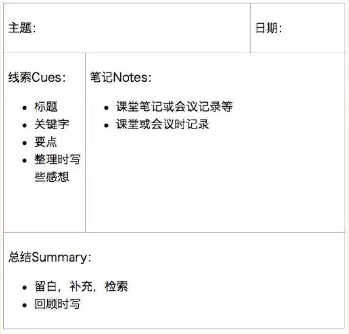 - 下课以后,尽可能及早将这些论据、概念简明扼要地概括(简化)在回忆栏,即线索栏。