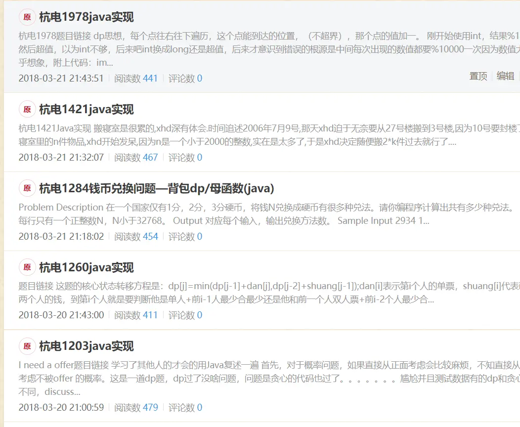去年刚来的时候也是三月份,当时和一个舍友一起下定决心得学点什么——学算法吧,两人一拍即合,恰巧两人都是java语言,变开始百度杭电oj刷题顺序,因为那时候刚刷题,往往一天只能AC一道题。两人虽然不坐在一块,但是一宿舍来回路上都在谈论题目,我们做的题目也都基本类似,也分享题目思路,从水题到贪心,从dp到dfs,bfs,这应该是最常用的算法吧,当时学了这些两个多个。我把一些自我感觉好题记录下来。当时那两个月也是猛的写了好多blog。到月末花了不少时间都记下来。