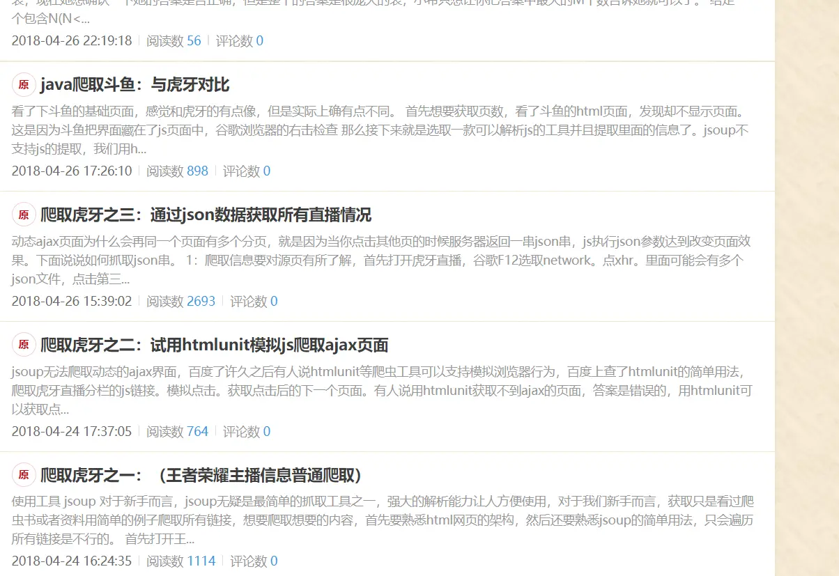 记得那时候当时刚好有个小project让我们选个方向分析一个东西。因为当时接触爬虫就打算自己抓数据。学习了jsoup和jdbc的基本使用,了解了一些dom树结构。记得当时卡的最深的就是动态生成的网页的抓取——ajax。因为当时根本没有这个概念。根本不知道原来数据是这样交互的,因为当时对web一点不了解。根本不了解前后端分离数据的渲染。百度了好久才勉强解决json的解析,用了阿里的fastjson。