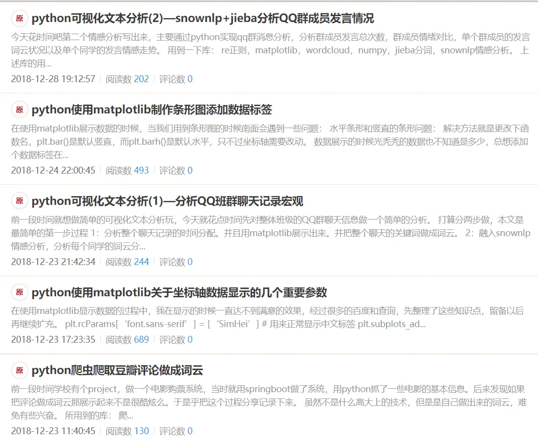 其实大三上好多考试课,组原,网络,操作系统,安卓,asp.net,oracle等系列课程。都需要大量时间复习,为了不挂了我也艰难的早早复习。我不太喜欢复习不感兴趣的东西但又不得不。这种感觉很难受,在这个阶段我就搞了点文本分析玩,比如jieba分词,wcloud词云,snownlp情感分析,matplotlib可视化,正则等等。然后把班群成员的发言稍微没价值的分析下玩。