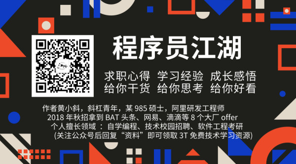作者黄小斜,斜杠青年,某 985 硕士,阿里 Java 研发工程师,于 2018 年秋招拿到 BAT 头条、网易、滴滴等 8 个大厂 offer,目前致力于分享这几年的学习经验、求职心得和成长感悟,以及作为程序员的思考和见解。(关注公众号后回复”资料“即可领取 3T 免费技术学习资源以及我我原创的程序员校招指南、Java学习指南等资源)