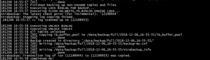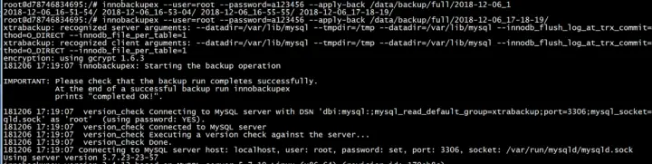 innobackupex --user=root --password=a123456 --apply-back /data/backup/full/2018-12-06_17-18-19/