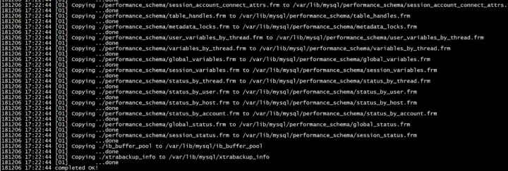 innobackupex --user=root --password=a123456 --copy-back /data/backup/full/2018-12-06_17-18-19/