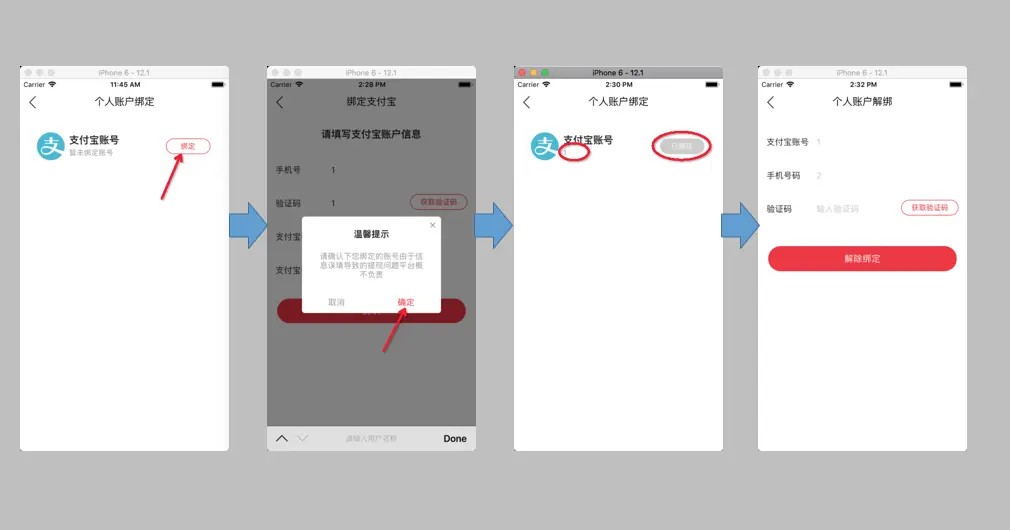 需要在填写页填写好手机号,验证码等,点击确认绑定后跳回到绑定首页。并且绑定按钮变为已绑定按钮,暂未绑定label变为输入的支付宝账号。并且点击已绑定按钮会跳转到解绑界面。