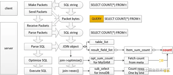 - COUNT( * ) 前置流程: 从 Client 端发 SQL 语句,到 MySQL-Server 端执行 SELECT 之前,为后面的一些阐述做一铺垫。