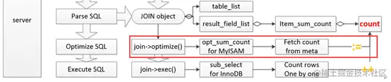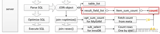- 共性:共性存在于 SQL 层,即 SQL 解析之后的数据结构是一致的,count 变量都是存在于作为结果列的 Item_sum_count 类型对象中;返回给客户端的过程也类似 – 对该 count 变量进行赋值并经由 MySQL 通信协议返回给客户端。