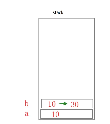 对着这张图就可以理解第一道题为什么会打印10了,当你声明一个变量,计算机会在栈中给你开辟一个内存空间去存储这个变量,当你去改变b的时候,那也只是去改变了b,所以a空间的值是不会受到任何影响,所以第一道题会打印出来10。