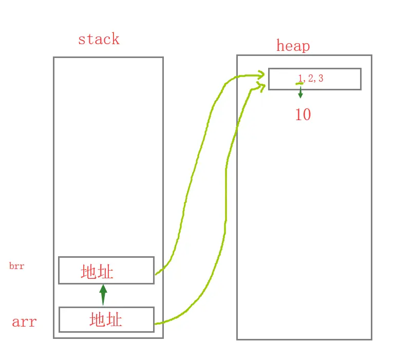 上面说了栈中存储的是基本类型的数据,如果是数组,对象等这些呢?上面这个图就能看出来,对应着第三道题看,如果定义一个arr = [1,2,3]。在栈中就会存储一个地址,在堆中就会存储对应地址的值,这个地址就会指向对应的数据,那这个地址在计算机中叫什么呢?其实就是所谓的指针变量, brr = arr; 叫做地址传值,你会发现brr在堆中是指向同一个位置,从而当你改变brr[0]的时候,arr[0]也是跟着改变了,所以第三那道题的答案也就出来了,不再是1而是10;所以这种地址传值也就称其为一改全改。