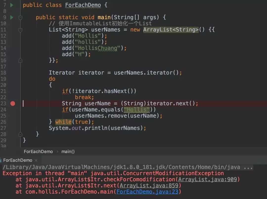 通过异常堆栈我们可以到,异常发生的调用链ForEachDemo的第23行,Iterator.next 调用了 Iterator.checkForComodification方法 ,而异常就是checkForComodification方法中抛出的。