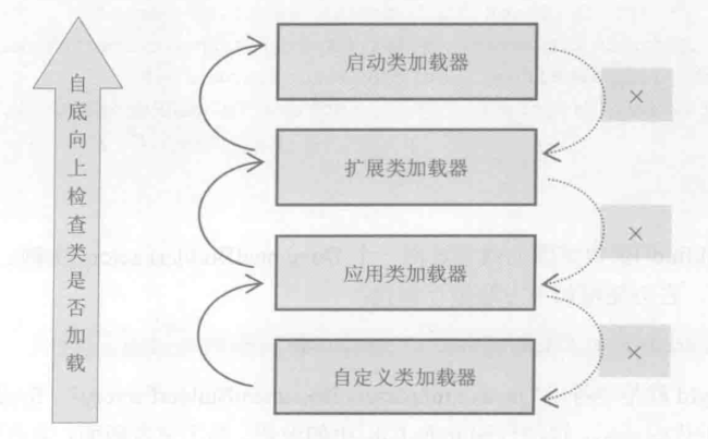 自下往上为自己的双亲。当系统需要使用一个类时,在判断类是否已经被加载时,会先从当前底层类加载器进行判断。当系统需要加载一个类时,会从顶层类开始加载,一次向下尝试,直到成功。