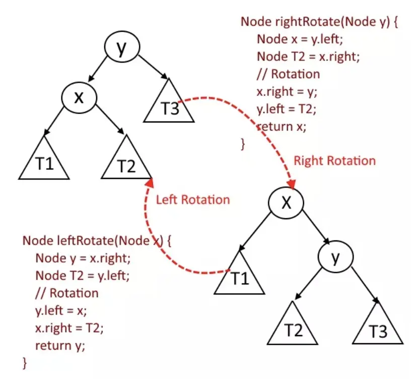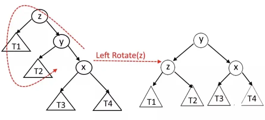 为了保证左右 2 棵子树的最大高度差为 1,我们需要在插入和删除时,对树进行旋转操作,以保证树的平衡性。有 2 种基本的操作,那就是左旋和右旋。