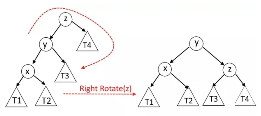 当 x 是 y 的左节点,y 又是 z 的左节点时,这个时候只需要把 y 节点向右旋转即可。如下图: