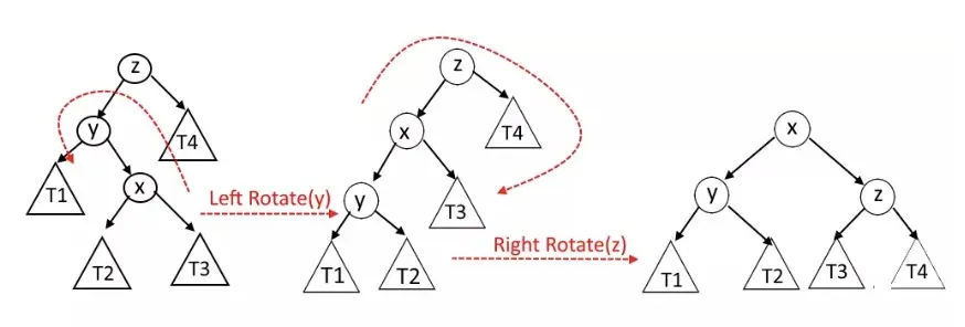 当 x 是 y 的右节点,而 y 又是 z 的左节点时,需要先把 y 左旋,变成 左左形态,然后再把 z 右旋。如下图: