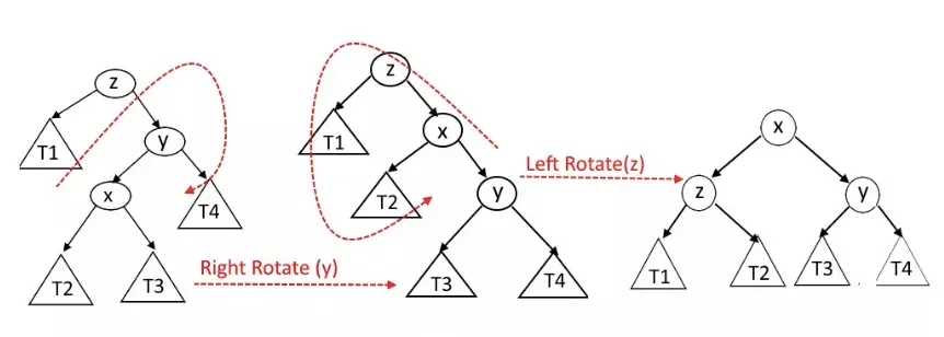 当 x 是 y 的左节点,而 y 又是 z 的右节点时,需要先把 y 右旋,变成 右右形态,然后再把 z 左旋。如下图: