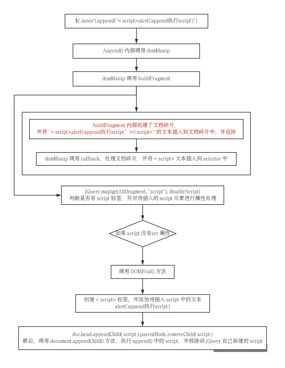2、当调用 $().append("<script>alert('append执行script')") 时,jQuery 内部的流程如下: