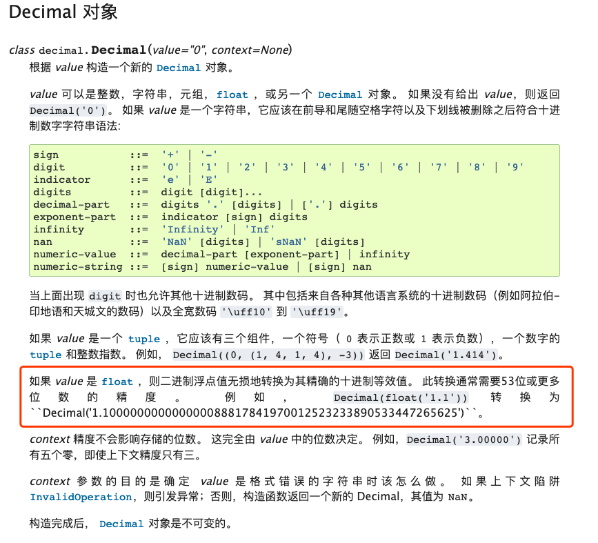官方文档已经很清楚地说明了,如果你传入的参数为浮点数,并且这个浮点值在计算机里面不能被精确存储,那么它会先被转换为一个不精确的二进制值,然后再把这个不精确的二进制值转换为等效的十进制值。