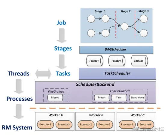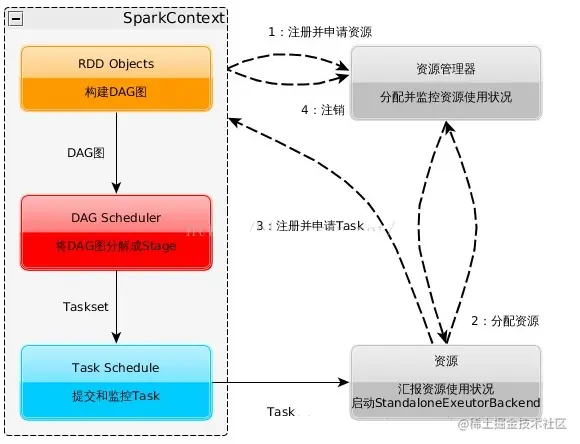 - ApplicationMaster中的SparkContext分配Task给CoarseGrainedExecutorBackend执行,CoarseGrainedExecutorBackend运行Task并向ApplicationMaster汇报运行的状态和进度,以让ApplicationMaster随时掌握各个任务的运行状态,从而可以在任务失败时重新启动任务