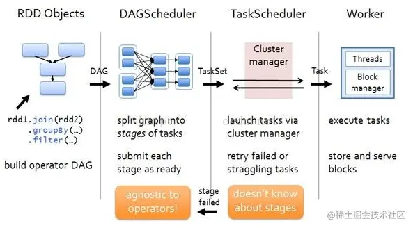 - SparkContext构建成DAG图,将DAG图分解成Stage、将Taskset发送给Task Scheduler,最后由Task Scheduler将Task发送给Executor运行