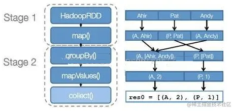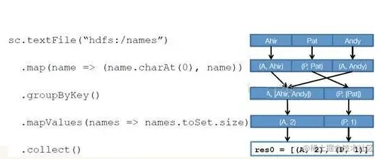 以下面一个按 A-Z 首字母分类,查找相同首字母下不同姓名总个数的例子来看一下 RDD 是如何运行起来的