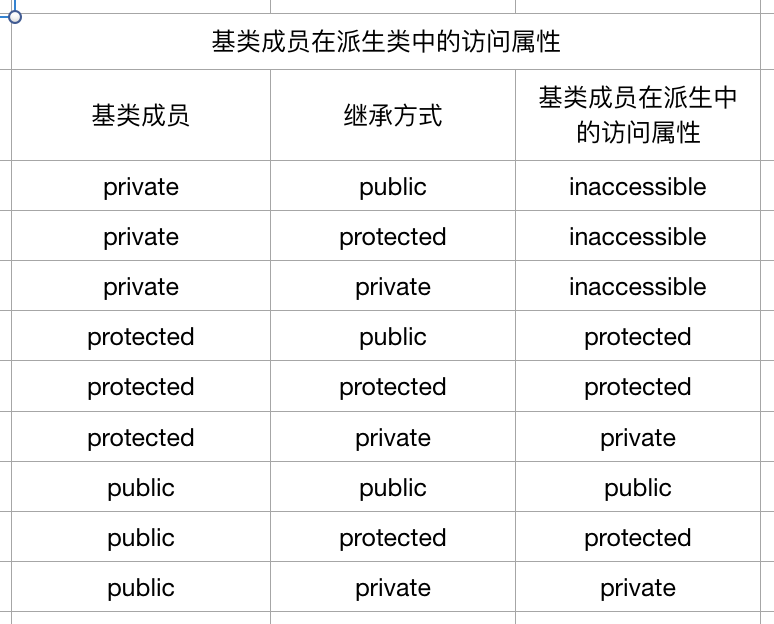 在派生类中, 对于成员的访问级别有四种, public(公有), protected(受保护), private(私有), inaccessible(不可访问)