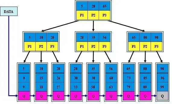 如上图所示,在 B+Tree 的每个叶子节点增加一个指向相邻叶子节点的指针,就形成了带有顺序访问指针的 B+Tree。做这个优化的目的是为了提高区间访问的性能,例如下图中如果要查询 key 为从 3 到 8 的所有数据记录,当找到 3 后,只需顺着节点和指针顺序遍历就可以一次性访问到所有数据节点,极大提到了区间查询效率。