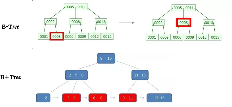 B+Tree 是 的变种,有着比 B-Tree 更高的查询性能,其相较于 B-Tree 有了如下的变化: